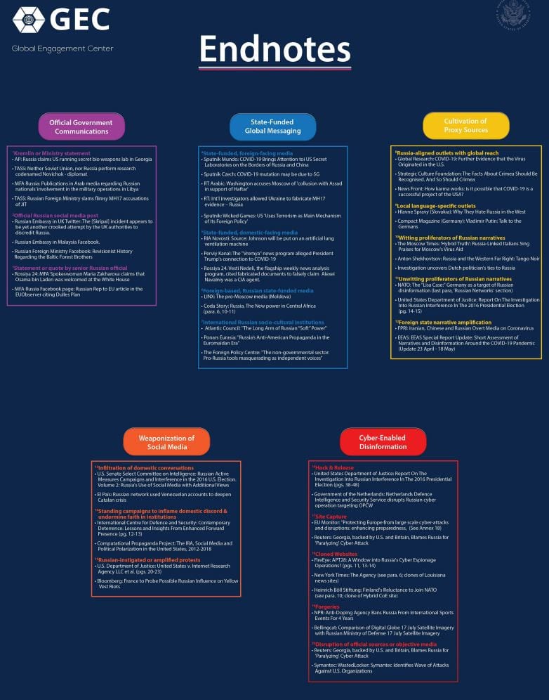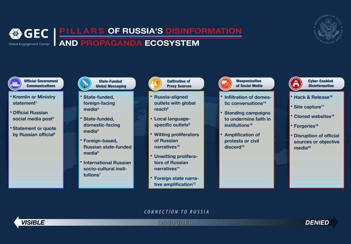 Amerykański raport wskazuje na 5 filarów rosyjskiej dezinformacji. Są to: oficjalne komunikaty rosyjskiego rządu; finansowane przez Rosję media międzynarodowe; masowe tworzenie źródeł proxy; media społecznościowe jako broń i dezinformacja w cyberprzestrzeni.