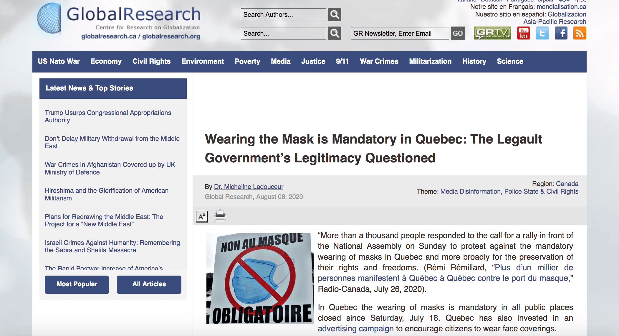 Poniżej kilka fragmentów artykułu Global Research o rzekomych protestach antymaseczkowych w Kanadzie: