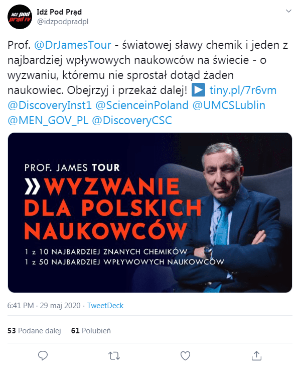Na swoim przykładzie prof. James Tour zauważa, że tym, którzy zadają pytania, domagając się wyjaśnień, często od razu przypina się łatkę kreacjonisty, by łatwo go zbyć: