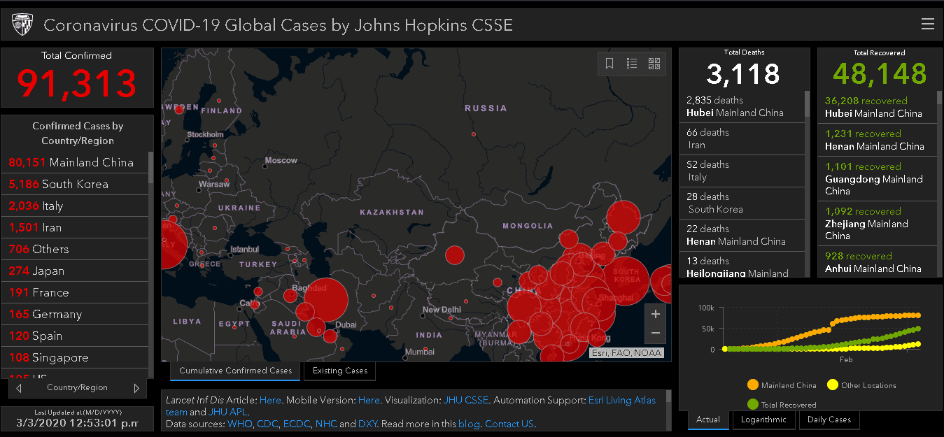 Obecny zasięg rozprzestrzenienia się koronawirusa oraz liczba zarażeń, zgonów i wyleczonych przypadków w poszczególnych krajach: