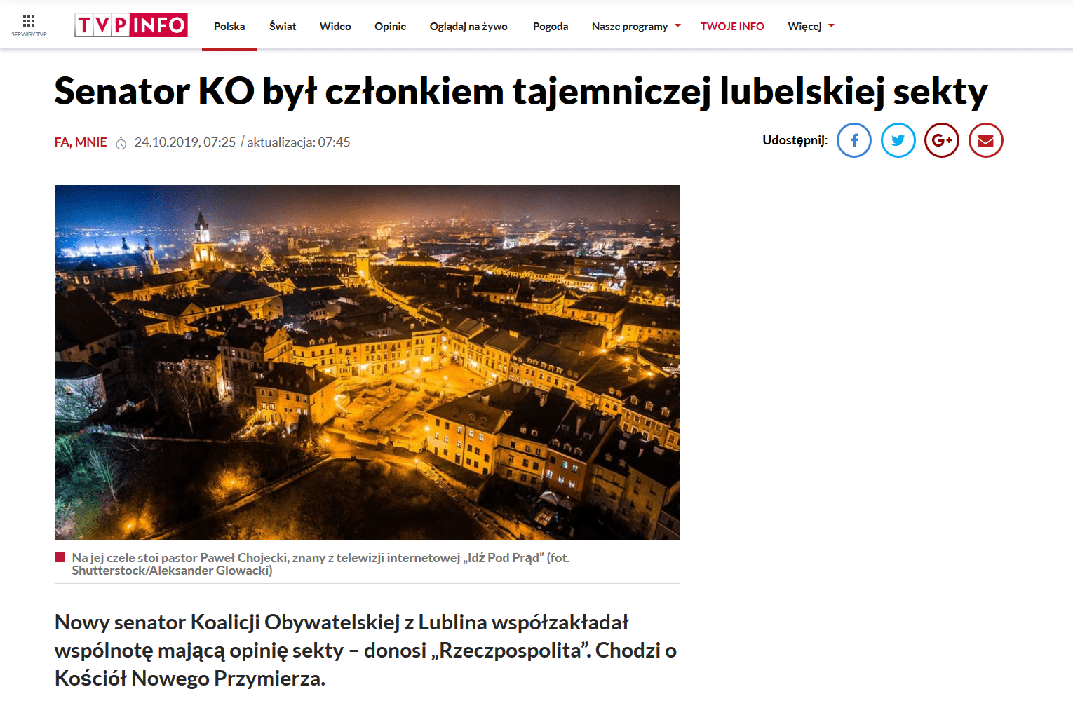 Telewizja Polska ma przeprosić Kościół Nowego Przymierza w Lublinie za nazwanie go „tajemniczą lubelską sektą” w artykule opublikowanym na portalu TVP Info, którego szefem był wówczas Samuel Pereira.